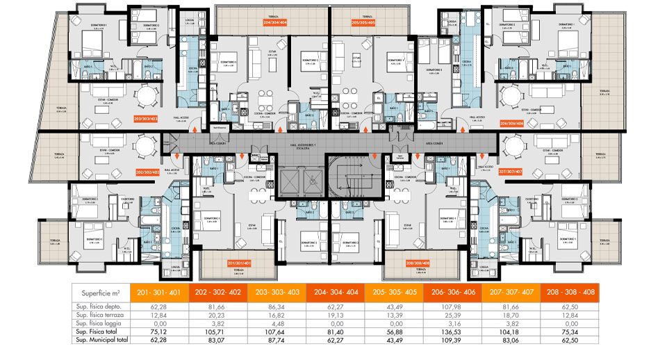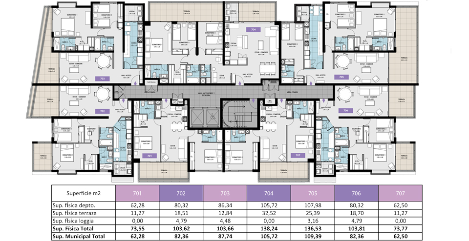 Edificio de 7 pisos, cuenta con 45 departamentos de 1 · 2 · 3 Dormitorios.